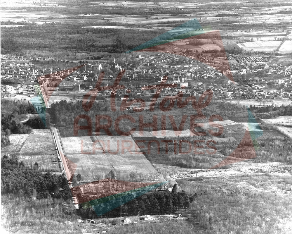 Ville de Saint-Jérôme, dans le secteur de la rue de Martigny, avant le passage de l’autoroute des Laurentides. On voit le cimetière de Saint-Jérôme, les champs, le Collège commercial