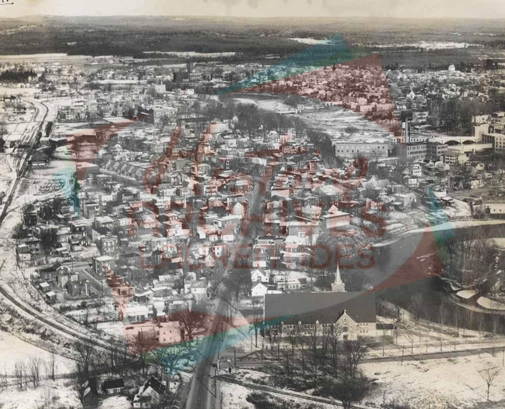 Secteur de l’église Sainte-Marcelle. On voit les bâtiments de la Regent Knitting Mills ainsi que le chemin de fer et la gare du Canadien National de Saint-Jérôme.