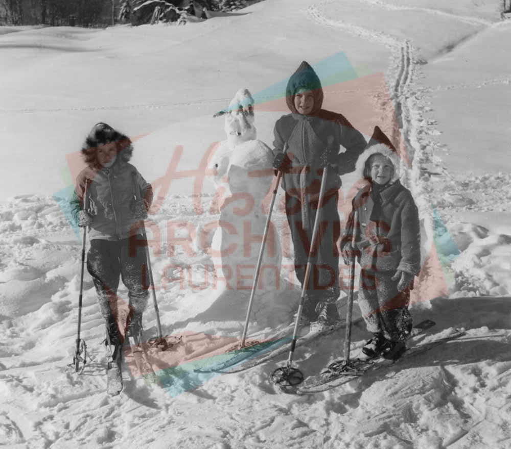 Trois des onze enfants de Victor Larose en ski de fond, près de leur bonhomme de neige, dans les environs de Val-Morin.