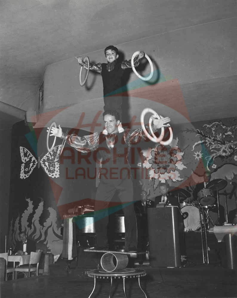 Spectacle d’acrobates à l’Hôtel Lapointe de Saint-Jérôme. On y voit un enfant debout sur les épaules d’un homme, tous deux tenant des cerceaux sur leurs bras.