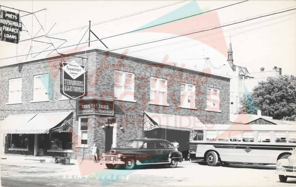 Terminus d’autobus de la compagnie Provincial Transport et le stand de taxis, situés au coin des rues Saint-Georges et du Palais.
