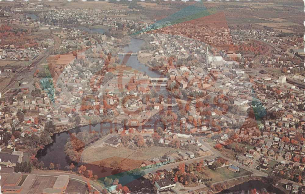 Vue aérienne en automne de la Ville de Saint-Jérôme avec la rivière du Nord qui serpente au centre.