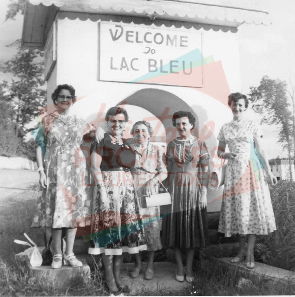 Groupe de cinq femmes devant l’affiche du lac Bleu à Saint-Hippolyte.